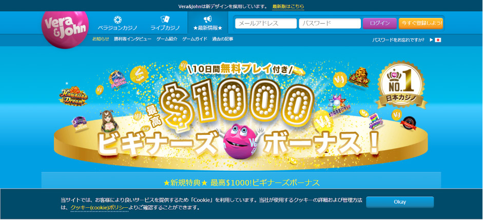 ベラジョン(Vera& John) カジノは、日本人登録者数NO.1の人気オンラインカジノです。