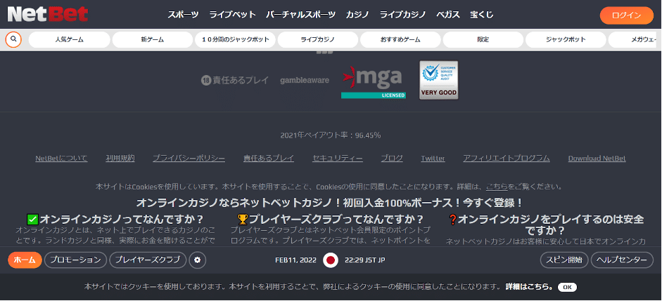 例えば、上記画像はNetBet(ネットベット)というオンラインカジノの公式ページですが、2021年の年間ペイアウト率(96.45%)が表示されています。